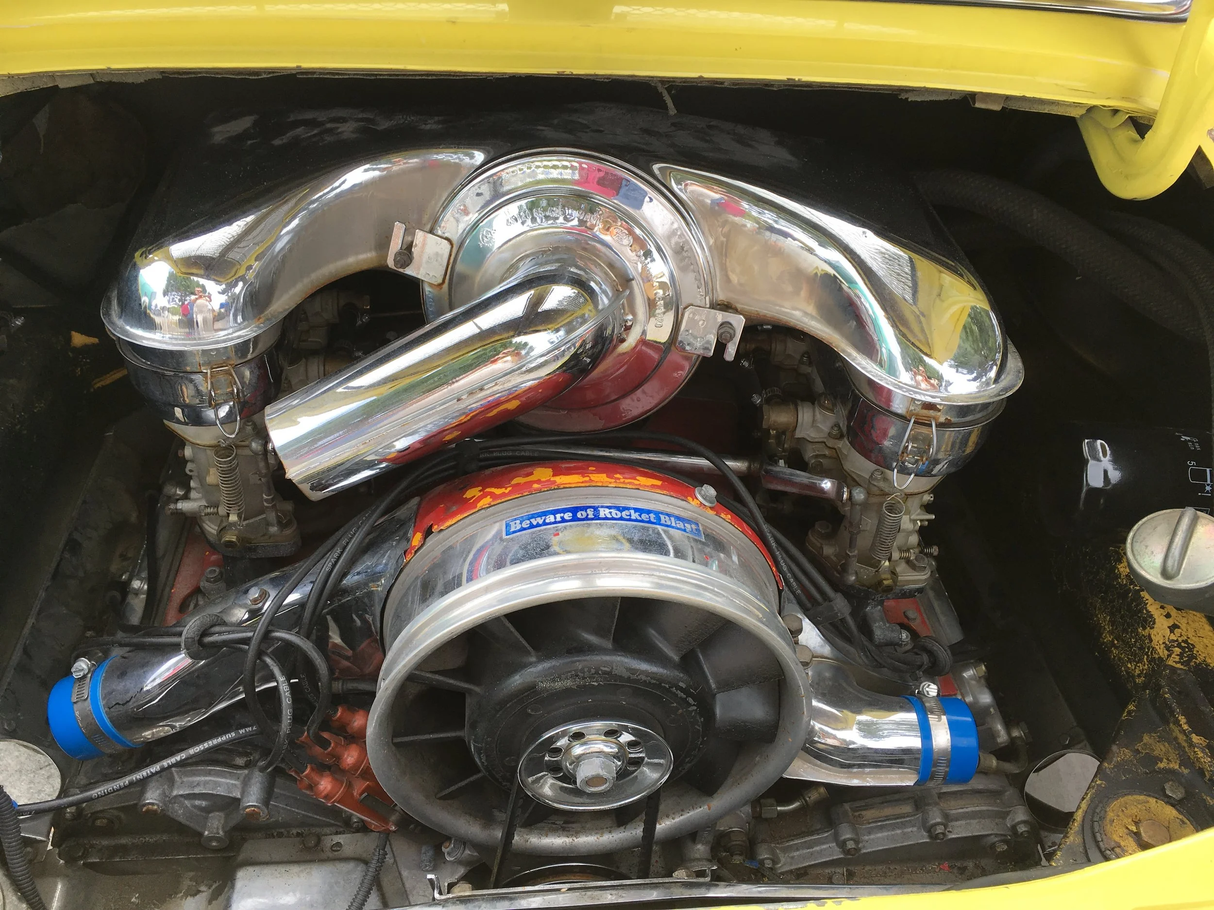 Also, if you are a stickler for originality, you might be able to detect one or two questionable cosmetic modifications in the engine bay. It's all gone a bit chrome in there. The sticker on the fan housing says "beware of rocket blast"... Aside from the visual crimes, I noticed that it was on Webers (should be Solexes, of course).